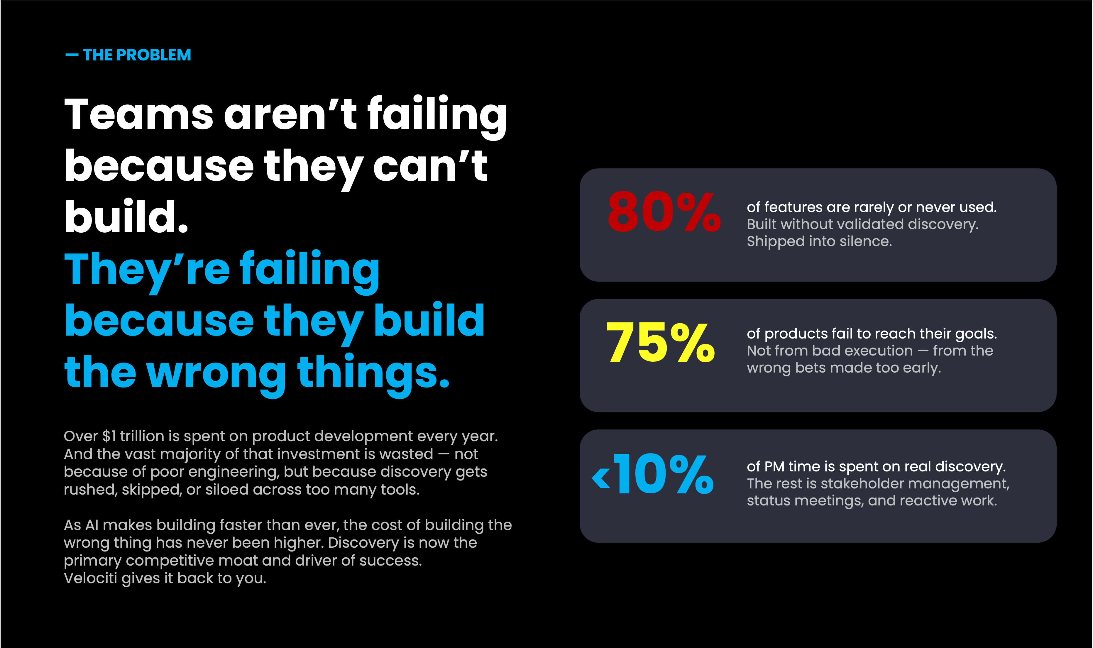 Velociti unifies discovery, strategy, and execution in one intelligent workflow — reducing tool sprawl, eliminating rework, and helping teams ship faster with less effort.
